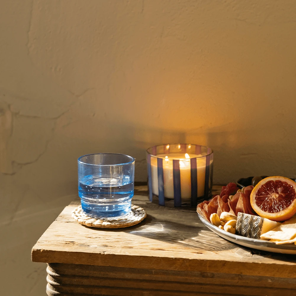 Fresh scents, sleek design, and sustainable vessels? Oh yes, you Cannes with the Al Fresco 12 oz. Candle – Rosemary + Sea Salt! Inspired by the umbrellas found on European beaches and the colors of the French Riviera, the Al Fresco collection showcases timeless striped glass vessels and refreshing fragrances. This 12 oz. candle is hand-poured in a reusable glass vessel with a stylish rattan lid that can be used as storage for jewelry, office supplies, or any small items after removing the wax.