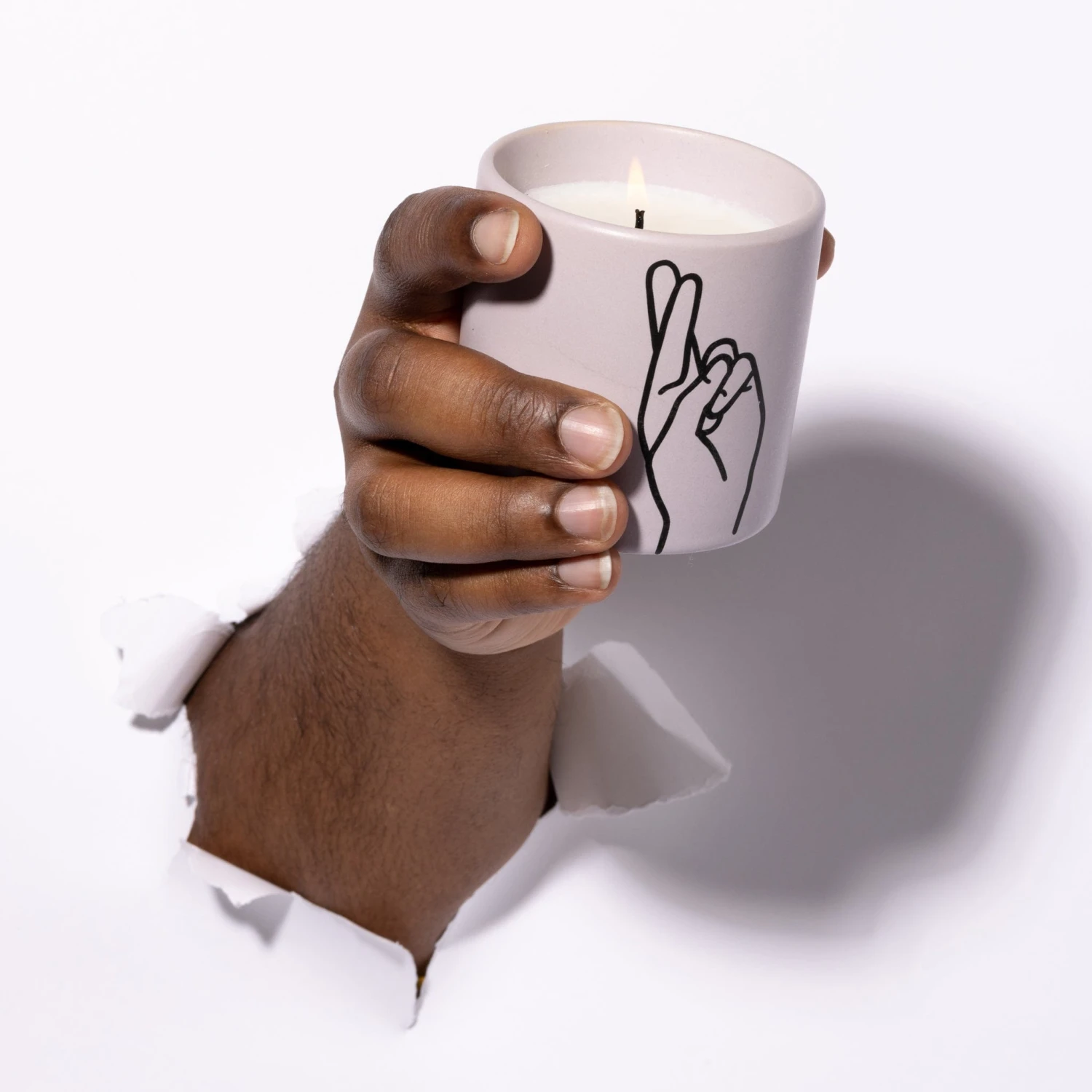 Fingers crossed! Express yourself with these colorful matte ceramic candles. Each candle comes with a gold foil stamped dust cover with a fun sentiment to share with the people you love.
