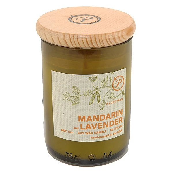 Paddywax Mandarin & Lavender Candle is sweet mandarin & fragrant lavender fragrance notes, hand-poured with Paddywax signature soy wax, into an upcycled wine bottle with wood snuff lid.