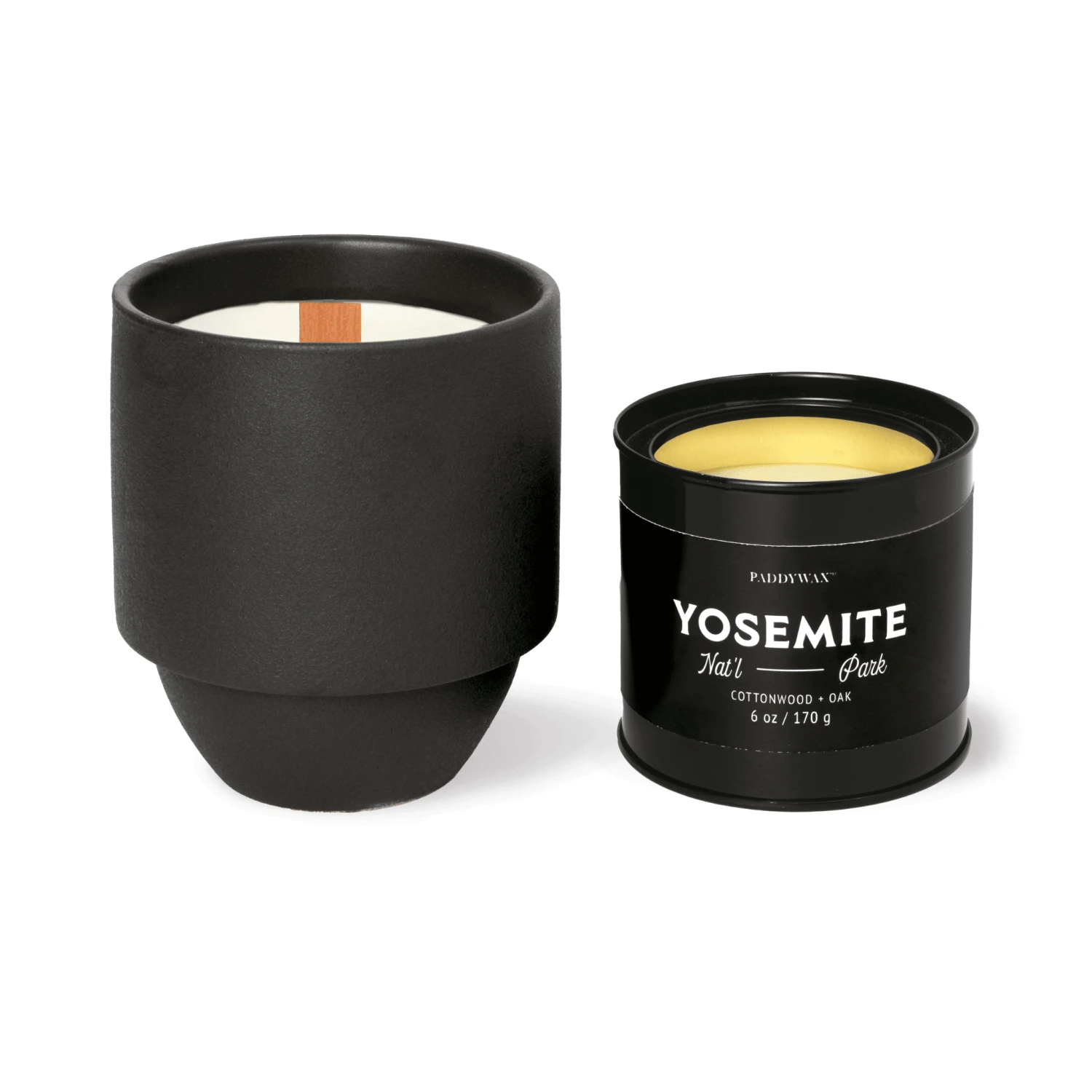 All the wonder of the wilderness in one 6 oz tin. Experience the beloved Parks Collection in a new way with our compact Parks 6oz Tin – Yosemite. Stylishly labeled in a tonal wrap with a cherry wood dust cover, each candle is fragranced with rich, invigorating scents inspired by the US National Park. Bring it along on your next adventure or gift it as a one-of-a-kind gift for the outdoor enthusiast.