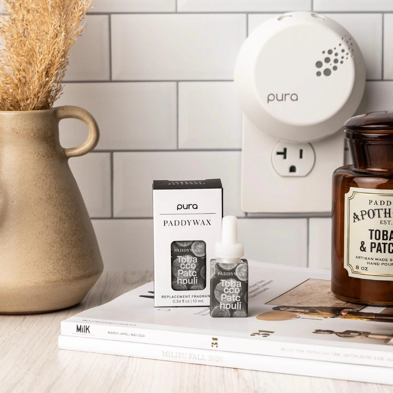 Includes (1)Â Pura Diffuser, (1) 10ml Ocean Tide & Sea Salt fragrance pod, and (1) 10ml Tobacco Patchouli fragrance pod