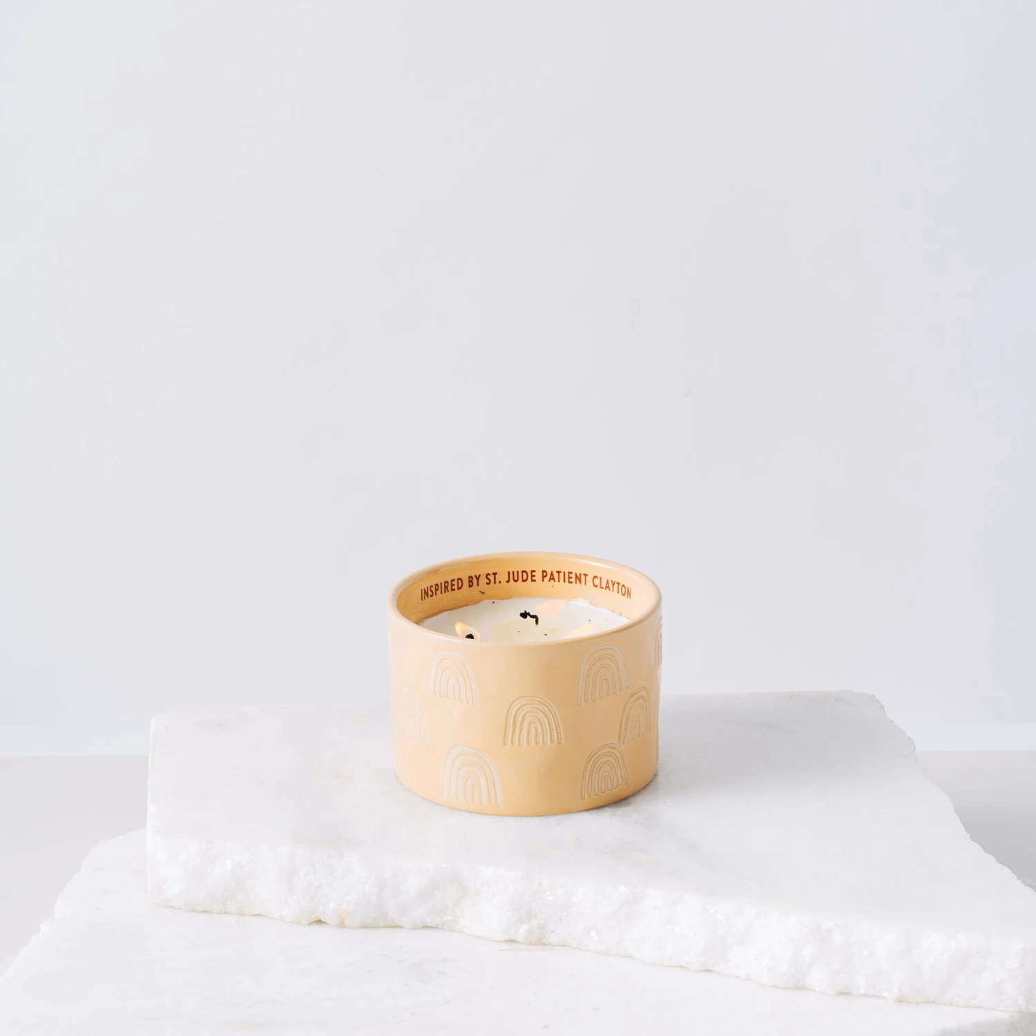 The Collection for St. Jude showcases colorful glazed ceramic candles featuring peaceful and uplifting fragrances with exposed clay pattern designs inspired by the artwork of St. Jude patients. This St. Jude Giveback 11 oz. Candle, inspired by St. Jude patient Clayton, is about the Possibilities ahead. While in treatment, Clayton illustrated a piece of artwork that featured rainbows. For this and many reasons, this candle is inspired by him.